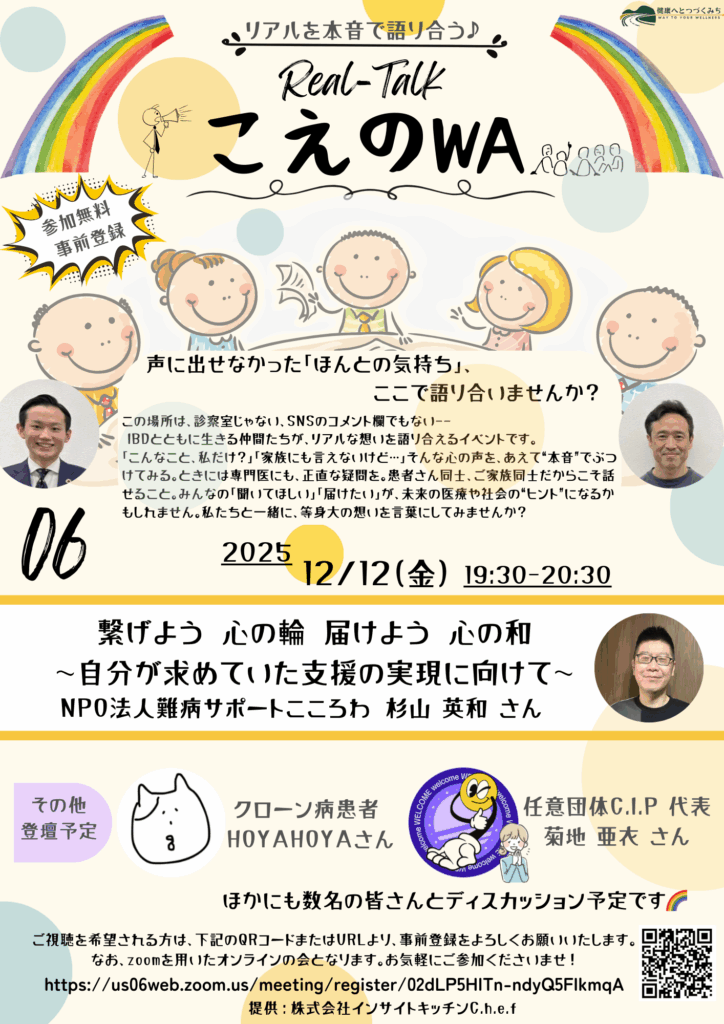 「こえのWA」は、IBDとともに生きる患者さんやその家族、関係者が、診察室でもSNSのコメント欄でもない“安心できる場”でリアルな声を語り合うことを目的としたZoomイベントです。タイトルの「WA」には、「輪・和・笑・話・我・環」という6つの意味を込め、対話によってつながる温かなコミュニティづくりを目指しています。